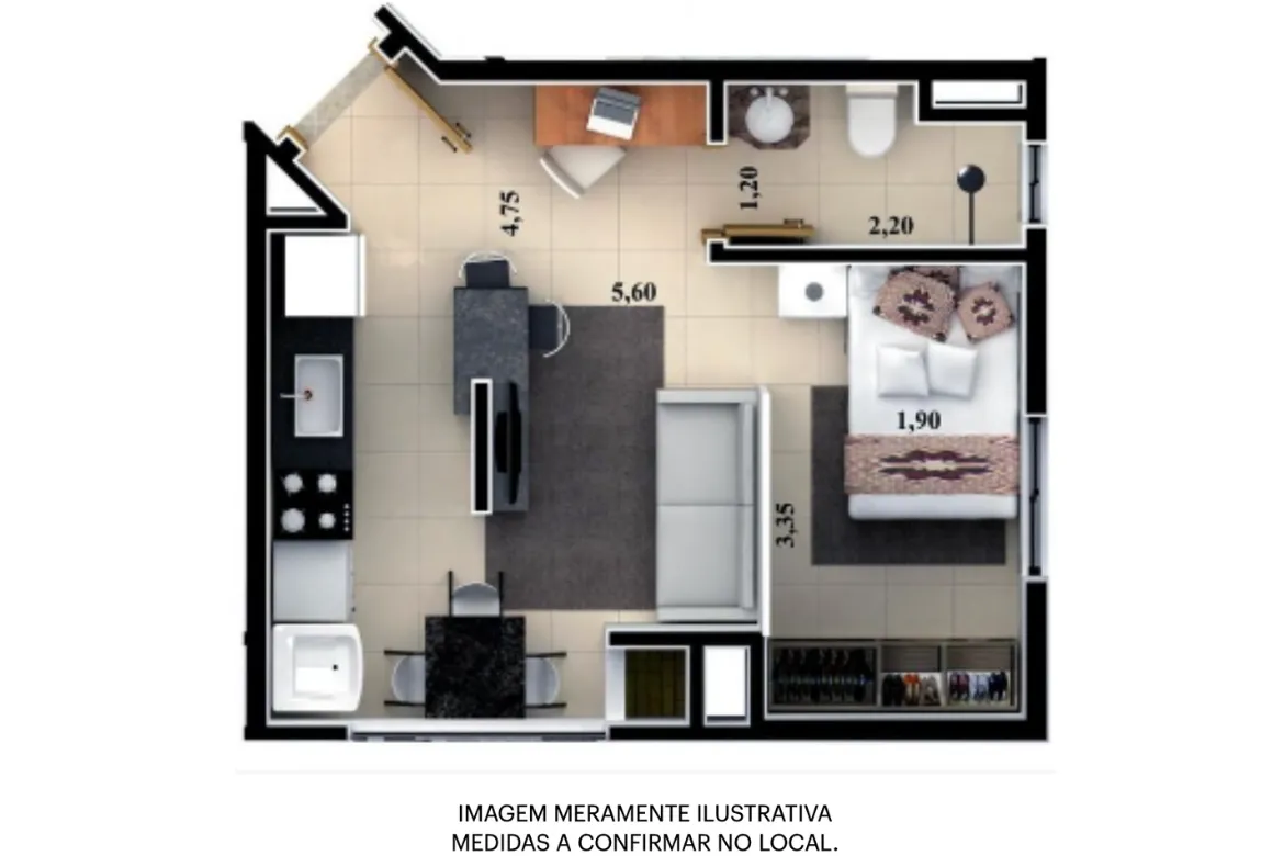 Cozinha americana, 1 quarto, 1 banheiro social.