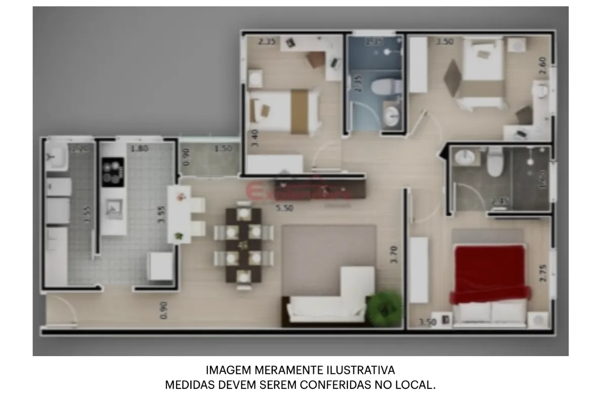 88m²/ 2 quartos + 1 suíte / 3 banheiros